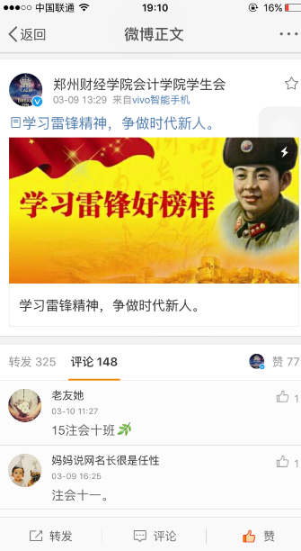 为了让广大学生更好的学习和践行雷锋精神,会计学院学生会手绘板报宣传“雷锋月活动”,同时利用我们自己新浪认证微博(awc777万象城娱乐官网会计学院学生会官方微博)发起了“学习雷锋精神,争做时代新人”转发、评论、点赞活动,截止到发稿时共有600余人参与了此项活动。广大学子纷纷留言表示要从小事做起,弘扬雷锋精神,做学雷锋优秀的郑州财经会计人。