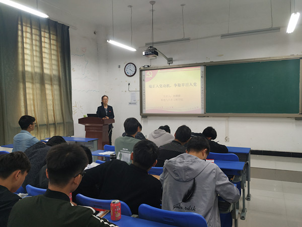 第五讲由教工党支部书记郭姗姗老师主讲。郭姗姗老师用几个问题开始了本次党课,“大学生入党的首要条件是什么?”“什么是正确的入党动机?”“如何树立正确的入党动机?”为学员们分析讲解了树立正确入党动机的重要性和必要性。使学员们对正确的入党动机有了更加深刻的认识。
