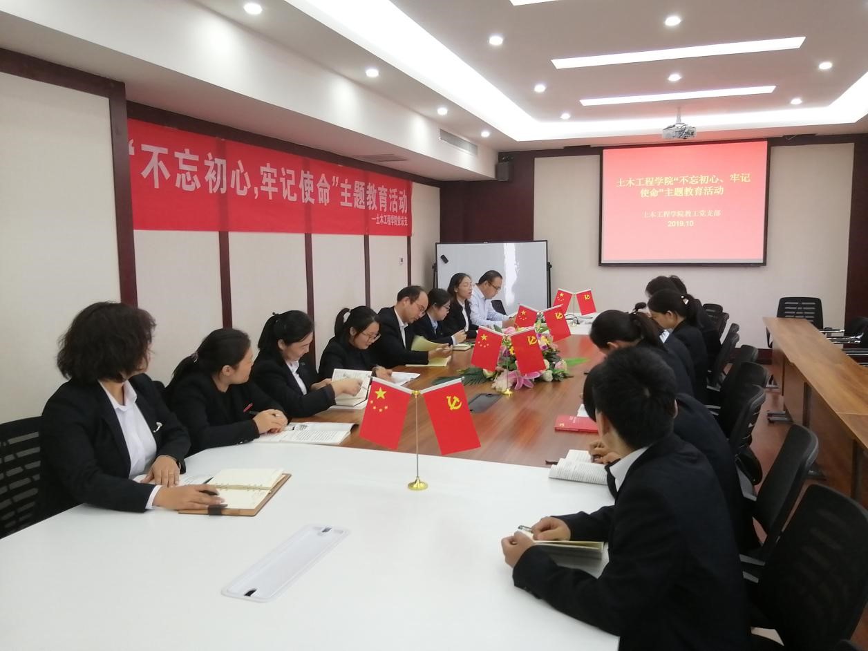 1010日下午,土木工程学院教工党支部在B座408会议室开展了“不忘初心、牢记使命”主题教育学习活动,旨在让学院教工党员更加深刻理解和学习“不忘初心、牢记使命”主题教育的意义、目标及要求;进一步学习习近平总书记视察河南重要讲话精神,深入贯彻领悟河南省教育大会精神。学院党总支书记焦建伟、教工第一支部书记罗芳及全体教工党员参加了主题教育活动。
