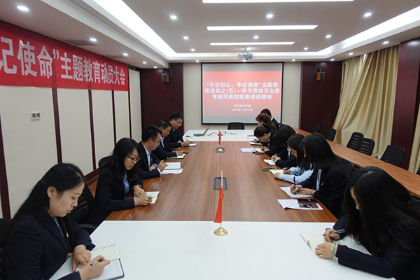 10月11日下午,现代教育学院于A608会议室举行第五次“不忘初心、牢记使命”主题教育。本次教育活动以“学习贯彻习近平总书记考察河南时重要讲话精神”为主题,学院党总支书记丁青山,党总支副书记曹亮,教学副院长郑琳娜,团总支书记胡亚东及部分党员教师代表参加了会议。