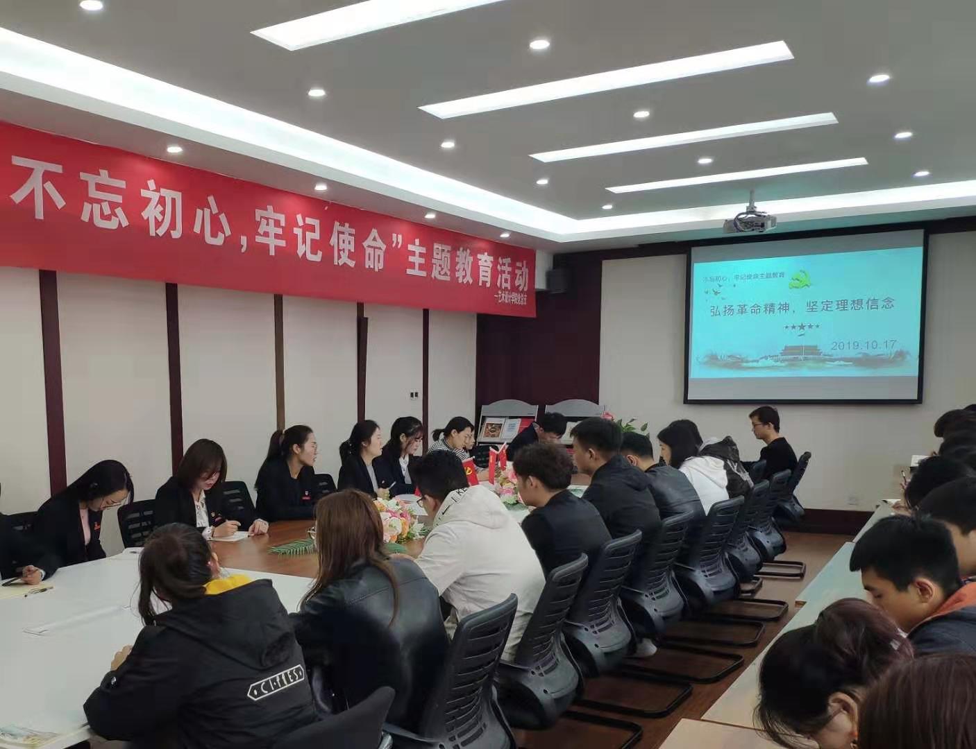 为深入学习贯彻落实习近平新时代中国特色社会主义思想与党的十九大精神,加强自身学习和党政建设,10月17日下午,艺术设计学院在B座508会议室召开“不忘初心、牢记使命”主题教育座谈会。学院教师杜艺华向大家分享了关于赴上海红色教育学习考察心得体会,学生第一党支部和学生第二党支部全体教师与学生党员参加了本次座谈会,会议由学生第一党支部书记和文敏和学生第二党支部书记崔灿主持。