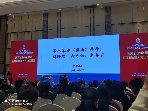 会议首先听取了教育部高等学校大学外语教学指导委员会主任委员何莲珍教授关于“深入落实《指南》精神:新阶段、新方向、新要求” 主题讲座。何莲珍教授首先就大学英语教学指导文件的演进过程进行了说明,并指出2020版大学英语教学指南是在《中国教育现代化2035》和《关于加快建设高水平本科教育全面提高人才培养能力的意见》等指导文件的精神指导下制订的。新的指南突出从学生成长需求和国家发展战略出发,旨在培养和储备具有国际意识和跨文化能力,通晓国际规则的优质人才。新的指南仍然继承了2015版《指南》对于大学英语兼顾人文和工具的课程定位,课程模块包含了通用以及专门用途英语和跨文化交际三大课程类别,同时又强调了将思政元素融入课堂教学,重视教师职业发展,突出教学方法与首段的创新等新的内容。何莲珍教授对外语课程思政的描述框架进行了详细说明,并指出三全育人要体现在学生的全面发展以及学习成长的全过程。