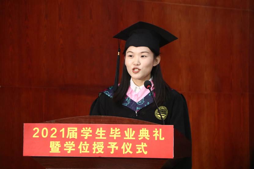2017级国际经济与贸易本科4班杨梦婷代表毕业生发言。她深切表达了对母校的热爱、对师长的感恩、对校园的依恋和不舍。并表示将带着母校的关爱,以奋斗之我,在工作岗位上锤炼品格,不负时代担当。