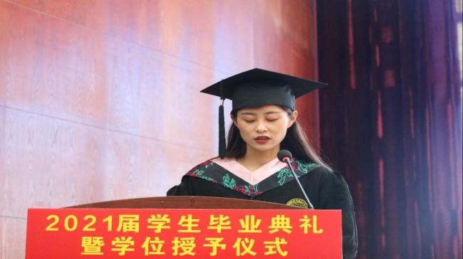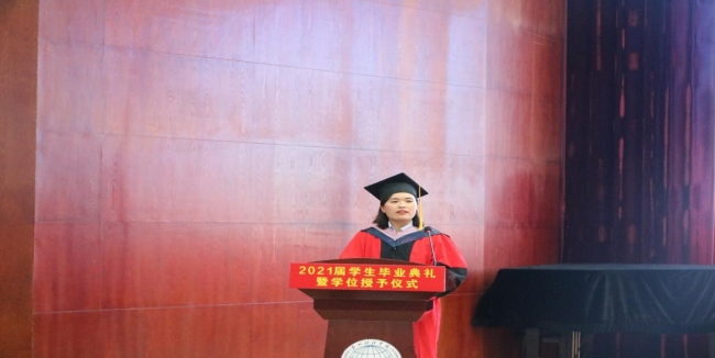 2021届毕业生代表安文静上台发言,她从自己大学的成长出发,回顾了在郑财生活的点点滴滴,表达了对母校、老师和同学们的依依不舍之情,表示一定会以梦为马,不负韶华,秉承财院“厚德、励志、笃学、敏行”的校训,为更好明天不懈努力奋斗!