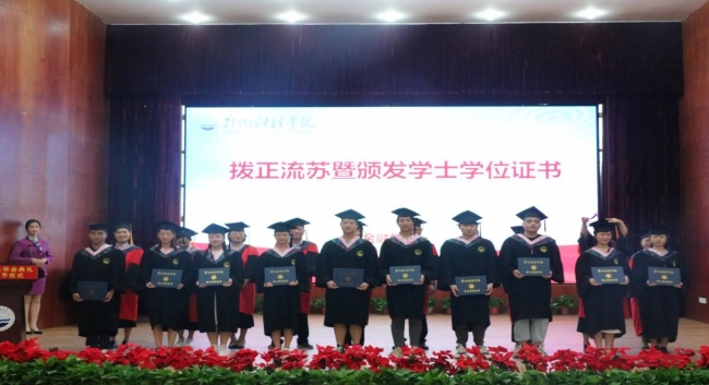 张效梅院长为毕业生扶正流苏并颁发学士学位证书。从左到右,拔去的是大学的稚嫩与过往,拨来的是学校给每位毕业学子的祝福与嘱托。