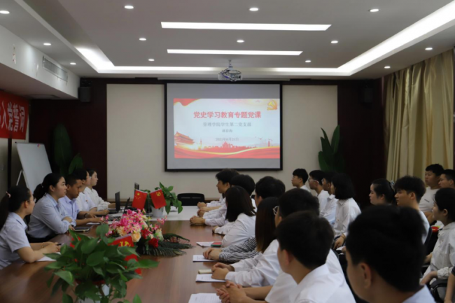 为庆祝中国共产党百年华诞,加强党史学习,坚定理想信念,6月24日,管理学院学生第二党支部书记郝春海作题为“重温延安精神,感悟百年初心”的党课辅导。管理学院党总支书记袁清、学生一支部书记李爽、支部委员路艳娜、魏玮及2021年上半年新发展预备党员参加本次党课。
