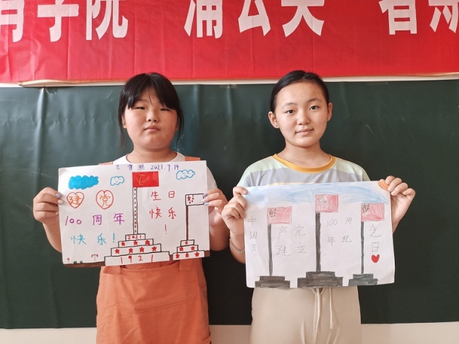 在焦作市、信阳市支教点,支教队员将学知识与学党史、强信念、长才干相结合,紧扣建党一百周年教学主题,开展了以小萝卜头故事为主的语言课,钢琴弹唱《我和我的祖国》、《国家》、《红星闪闪》等音乐课,爱国主题的绘画课等,在传播知识的同时,将爱党爱国之情深植学生心间。