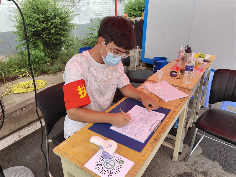 商学院2018级国贸专业本科2班学生邵宗汗, 8月7日参加了长垣市常村镇前大郭村组织的青年志愿服务队,在村口开展疫情防控卡点测温扫码工作,并对外来车辆进行排查,指导司机登记。邵宗汗白天在岗口认真执勤,傍晚仍积极前往村大队部开展疫情期间人员排查表登记工作。