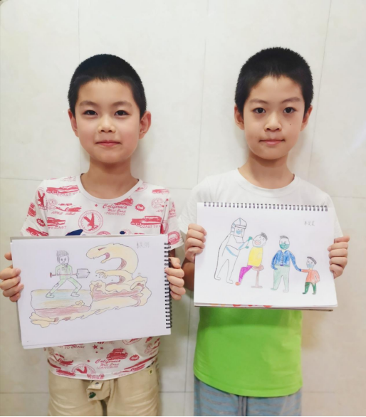 秦性英老师亲子绘画作品《致敬抗洪救灾英雄》《新冠防疫从我做起》