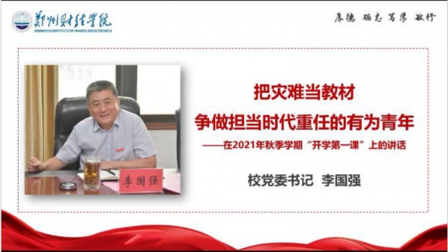 上午9:00,万象城2021年秋季开学第一课正式开讲,学校监事会主席李庆阳主持课程。在嘹亮的国歌声中,管理学院师生在不同场合站立注目鲜艳的五星红旗,同唱国歌参加升旗仪式。随后,学院师生收看了河南省教育厅厅长郑邦山的讲话视频,牢记“把立德树人作为根本任务,用大爱育人心,与中原同崛起;把灾难当教材,与祖国共成长”嘱咐。