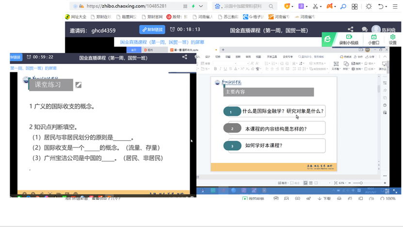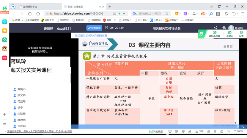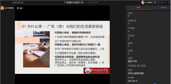 在《国际金融学》《海关报关实务》《电子商务网站建设与维护》《广告理论与实务》等课程中,何雪婷、蒋凤玲、郭云、宋朝冉等教师使用超星平台进行直播授课,同时通过平台进行教学互动。