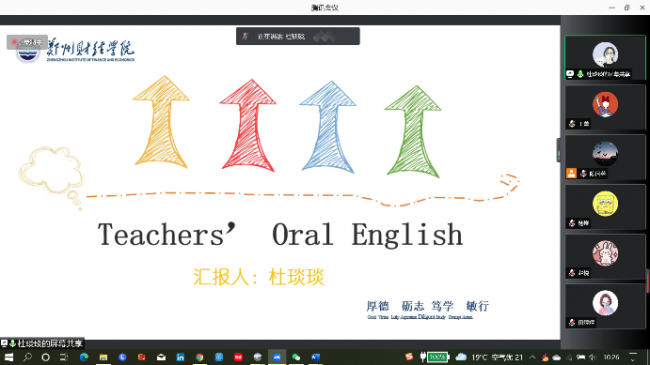 杜琰琰老师以“Teachers’ Oral English”为主题,循序渐进地向大家展示了教师口语课的课程导入、教学内容、教学重难点以及和学生互动的流程和内容,为大家带来了一场纯英文的听觉盛宴。