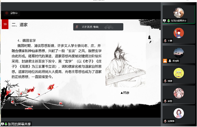 张雨老师以《中国文化概要》中的“魏晋玄学”为主题,结合历史背景,将主要内容娓娓道来,借助PPT分别向大家展示了课程导入、教学内容、教学重难点以及和学生互动的流程和内容,向受众刻画了生动的“嵇康”和“玄学”形象。