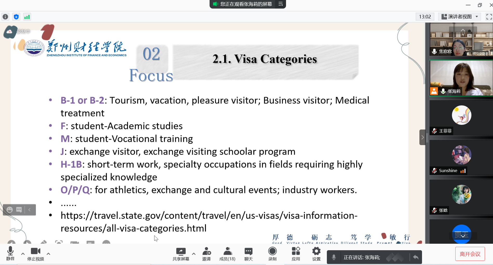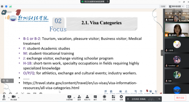 商务英语专业教研室张海莉教师结合自己所授的《商务英语口语》课程进行讲解示范。本次示范课程内容围绕“Entry Visa”展开,分为课前预习、知识点讲解、针对练习、课后作业及作业展示评估五个部分,张海莉老师在利用腾讯会议平台授课的同时将超星学习通各种学习活动(如:抢答、选人、主题讨论等)相结合,丰富教学内容的同时也提升了学生的学习兴趣。