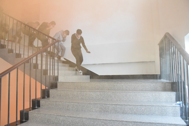 随后,李教官与参加讲座的人员在劳作楼五楼进行了一场消防实战演练。在浓烟逃生演练环节,工作人员用烟雾弹模拟火灾浓烟现场,在烟雾弹的作用下,浓烟四起,在场人员用事先准备好的毛巾、纸巾捂住口鼻,猫着腰、摸着墙壁有秩序地向安全出口逃生,通过实际操作体验如何正确火灾逃生。