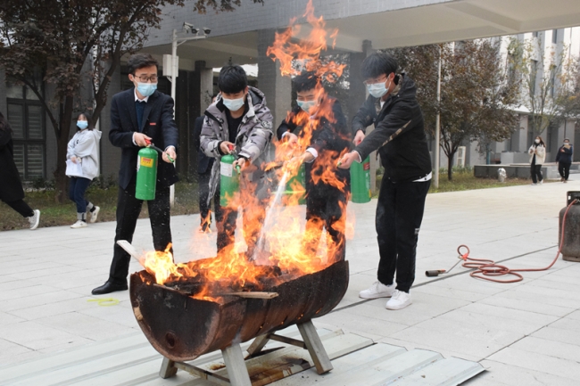 在灭火演练现场,李教官教大家如何使用灭火器进行灭火。各位师生踊跃尝试,体验灭火器材的使用方法,火盆中的熊熊大火被扑灭后,李教官对灭火步骤和灭火现场进行讲评,并向各位师生介绍了发生火灾时应该注意的逃生事项:保持冷静、不要乘坐电梯、正确辨别方向、做好防烟工作等,为大家带来了一场别开生面的消防安全知识培训。