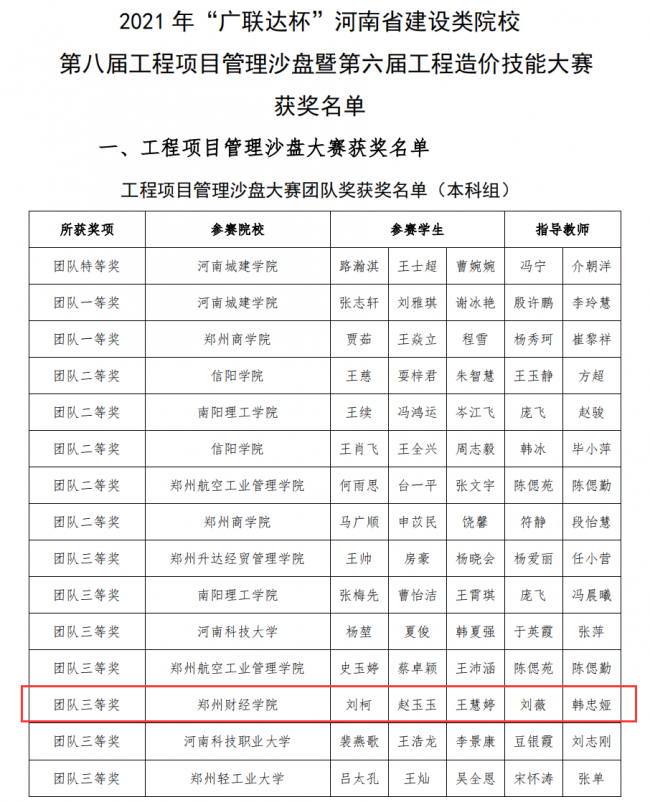 10月31日,2021年“广联达杯”河南省建设类院校第八届工程项目管理沙盘暨第六届工程造价技能大赛通过广联达自动化考试系统进行,此次大赛共分为两个赛项,其中工程项目管理沙盘大赛共有来自21所院校的32支本、专科院校代表队参加。经过45天的赛前准备与培训,由土木工程学院学生刘珂、赵玉玉、王慧婷组成的“三人行”团队荣获工程项目管理沙盘赛项团队三等奖。