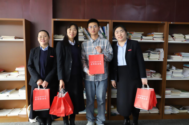 管理学院教师为大四考研学子手写贺卡送上考研祝福,并将印有“考研加油、成功上岸”的定制可乐和考研文具用品作为礼物亲手打包,一份份精美的加油包,装满了学院师生对考研学子的满满祝福。