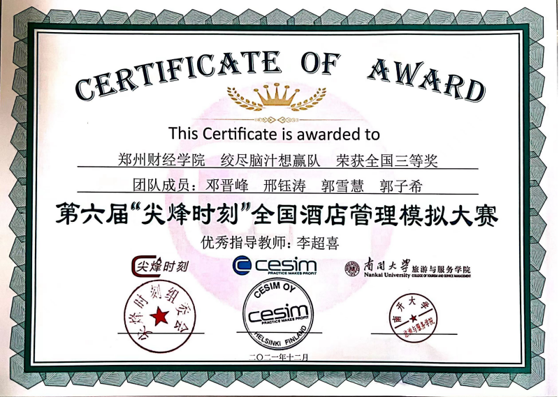 近日,由“尖烽时刻”组委会和南开大学主办的第六届“尖烽时刻”全国酒店模拟大赛圆满结束,本次比赛分为初赛、复赛和决赛三个阶段,吸引了中山大学、厦门大学、复旦大学等国内双一流高校在内的85所院校、532支队伍参加,管理学院酒店管理专业学生首次参赛,学生组成的“绞尽脑汁想赢队”、“尽显锋芒队”荣获全国三等奖,两支队伍指导老师李超喜、王子辉被评为“优秀指导教师”。