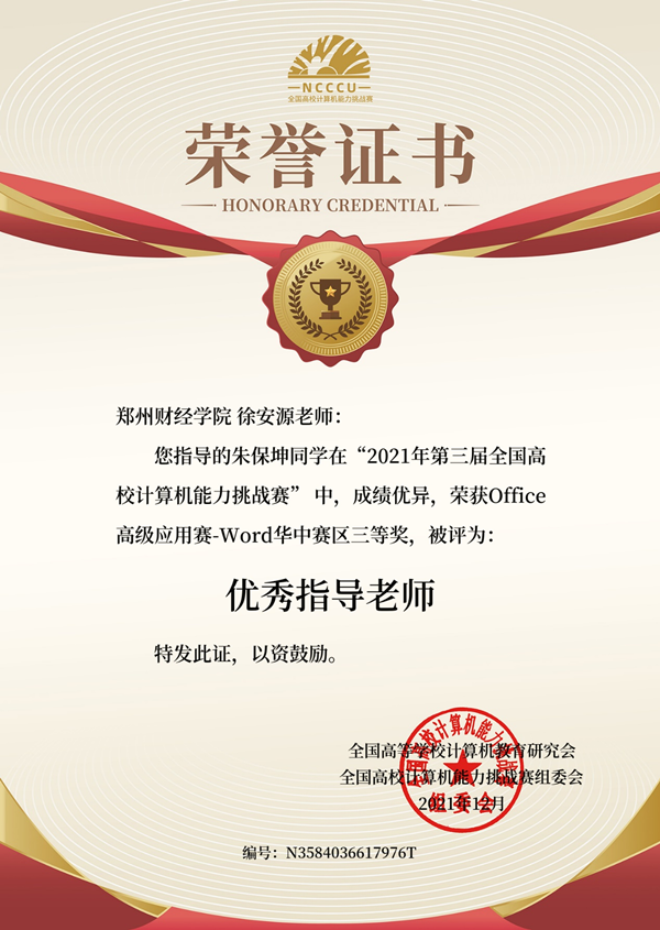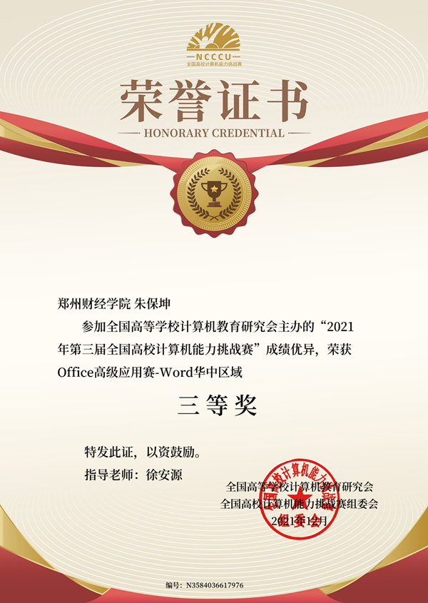 近日,由全国高等学校计算机教育研究会主办,商丘学院承办的“2021年第三届全国高校计算机能力挑战赛”区域比赛和全国比赛结果揭晓。万象城信息工程学院2019级网络工程本2班朱保坤同学分别获得Office高级应用赛-Word华中区域三等奖和全国决赛二等奖, 指导老师徐安源荣获区域赛和全国决赛“优秀指导老师”证书。