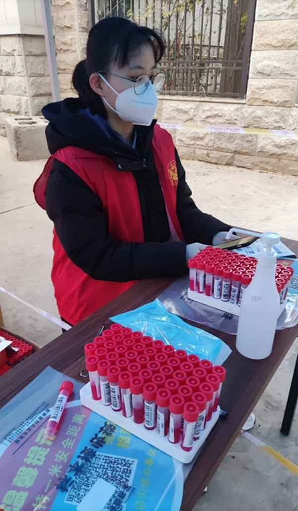 2021级大数据科学与技术2班郁申菲在郑州进行全民核酸检测期间,主要负责社区核酸检测人员的扫码登记工作。在工作期间,郁申菲始终保持严谨认真的工作态度,不断加强服务意识,严格遵守志愿者规章制度。她说:“我很荣幸能够成为一名社区志愿者,为疫情防控工作贡献自己的一份力量。作为一名新时代青年,应当不断提升自我、敢干敢拼,只争朝夕、不负韶华。”
