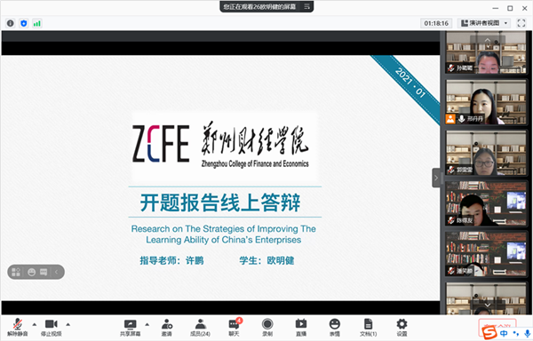 本次线上答辩包括汇报论文选题的目的意义、研究计划,以及答辩组提问两个环节。参加答辩的学生认真准备,从论文题目来源、选题依据、选题目的和意义,论文的研究思路、所采用的方法和技术准备情况,论文工作进度安排等方面详细介绍了论文的准备和撰写计划。