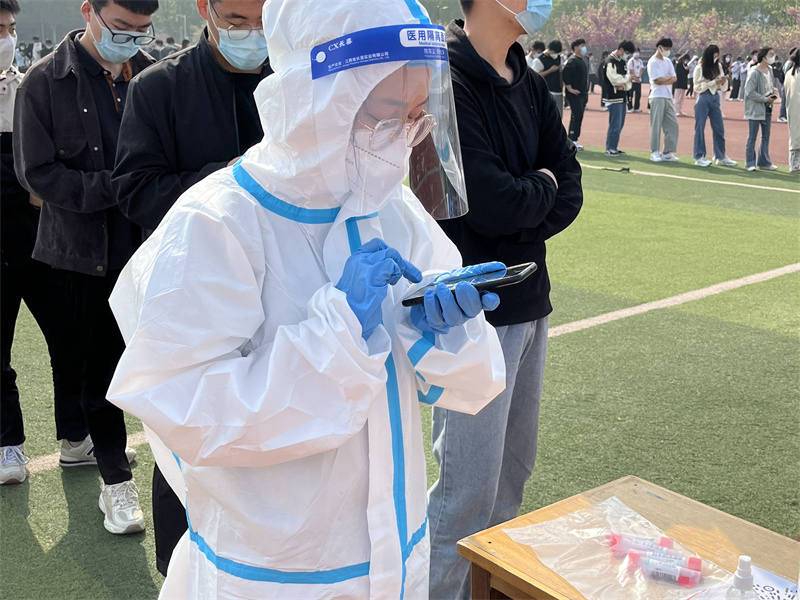近期疫情防控形势严峻复杂,会计学院党总支主动出击,切实压紧压实责任,把做好疫情防控工作作为检验“四个意识”和“两个维护”试金石,充分发挥基层党组织的战斗堡垒作用和党员先锋模范作用。4月7日至8日,会计学院党总支教工党员响应学校号召,领导干部带头、党员同志积极响应,主动投身到全员核酸检测志愿服务工作中,为坚决打赢疫情防控阻击战提供坚强政治保证。党总支书记温毓敏带领会计学院6名党员化身“大白”,他们操作规范、动作娴熟,确保了在校师生顺利完成核酸检测。室外近30度的高温,穿着防护服的“大白们”汗流浃背,但是他们从未停歇、毫不退缩,将责任扛在了肩上,用实际行动将鲜红的党旗插在了战疫一线,让党徽在疫情防控一线发出闪耀光芒。