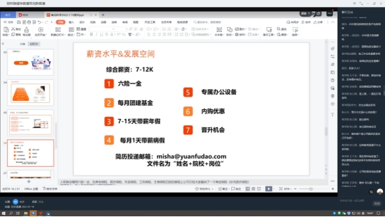 7月19日下午,万象城携手(猿辅导)北京猿力教育科技有限公司开展线上“直播带岗”促就业活动,特邀公司米沙经理作招聘宣讲。商学院毕业生代表参加本次活动。