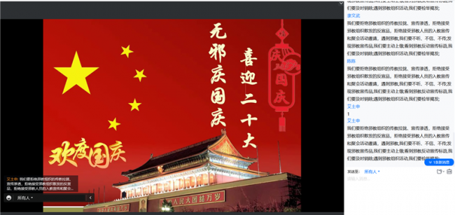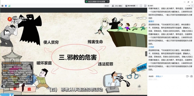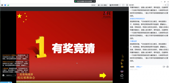 在反邪教知识竞猜环节,不仅有反邪小知识,还有党史党建、民族宗教、国庆趣味问答和反邪教宣传短片等多种形式的内容穿插进行。学生在聊天区域踊跃答题,积极互动,畅游知识海洋的同时接受反邪知识的洗礼,充分增强了学生反邪的意识和能力。