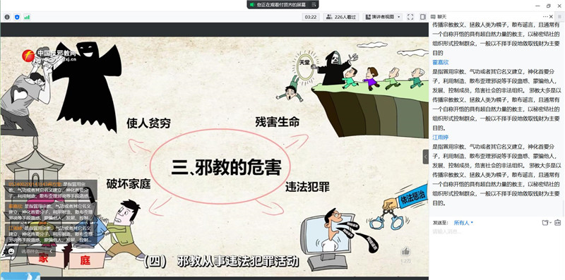 本次活动共分为三个环节,活动初始,师生们共同观看了《awc777万象城娱乐官网反邪教协会工作展示》及《反邪教口号接力》两部反邪教宣传视频。