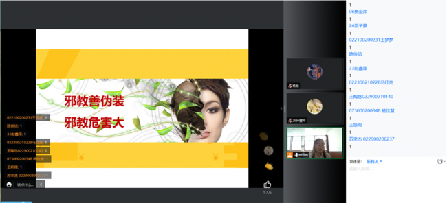 最后,党委统战部副部长王艳杰作总结发言。她重点阐释了邪教善伪装、邪教危害大,并号召广大学子提高警惕,远离邪教,共同维护校园和谐稳定。