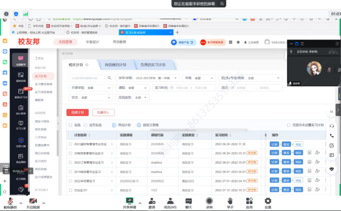 会后,为提升实习工作信息化程度,加强实习指导教师和毕业生之间的沟通,更好地留存实习过程性材料,学院邀请河南校友邦实践教学平台负责人李彩密老师针对毕业实习平台的使用进行相关培训,全体与会人员参加培训。