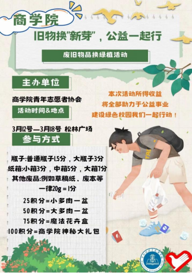 为引导同学们更好地践行绿色环保、节约健康的生活方式,3月12日至18日,商学院青年志愿者协会举办了“旧物换新芽,公益一起行”废旧物品换绿植活动。学生通过收集废纸箱、废瓶子和其他废品兑换相应积分,不同积分兑换不同绿植,最后将本次收益全部捐献给公益事业。这次活动不仅宣传了绿色环保理念,提高了同学们的环保意识,同时也捐献了爱心,通过支付宝公益帮助甘肃高原地区的小朋友们喝上干净安全的水。