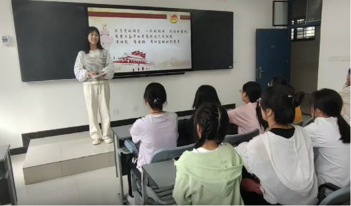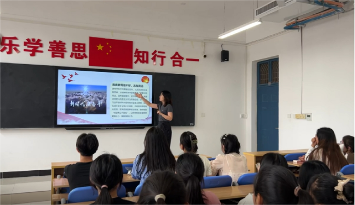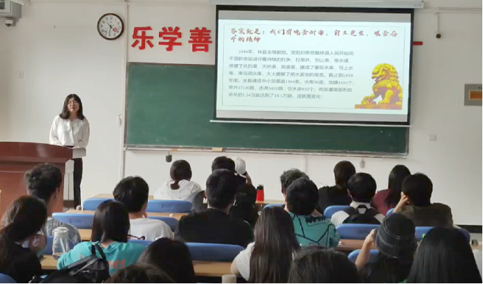 鲁梦琳老师讲解了红旗渠修建的艰难过程,带领同学们深入学习了“不认命,不服输”的红旗渠精神,深刻认识到红旗渠精神在新时期的重要意义。红旗渠修建前,林县百姓每天都要翻山越岭挑水吃。为了林县百姓福祉,在中国共产党的坚强领导下,林县人民仅凭双手和简陋的工具,修成了这工程浩大的红旗渠,在修建过程中,协调工作没有推诿扯皮、没有议而不决,而是讲政治、顾大局,一切从人民的利益出发,社会主义制度的优越性在红旗渠的修建过程中得到了充分体现。她指出,青年一代应当用全力谱写“奋勇争先,更加出彩”的青春答卷,让历久弥新的红旗渠精神成为自己的青春誓言。