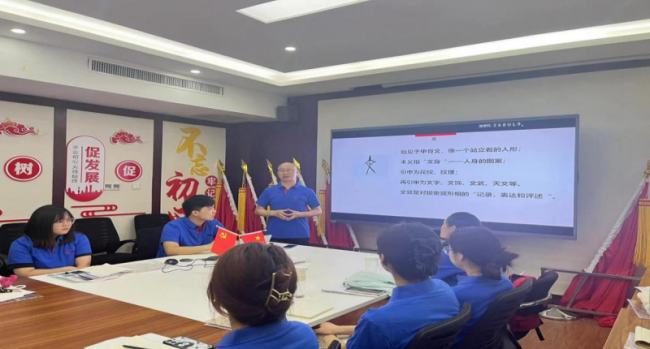 “文化课堂”上,宇鑫学院常务副院长王遂昌从企业文化内涵、“宇鑫”简介、宇鑫物流企业文化解读、宇鑫物流对人才的需求以及如何在宇鑫物流成长和发展五个方面为学员们展开讲解。让学员们印象最为深刻的是他在开篇中讲到的“文以化人”,“文”始见于甲骨文,像一个站立着的人形;本义指“文身”,即人身的图案,引申为花纹、纹理,再引申为文字、文饰、文武、天文等。他讲到,宇鑫物流集团的精神支柱就是宇鑫物流的企业文化,指引着宇鑫物流为宇鑫人创造更美好的生活,实现企业价值。