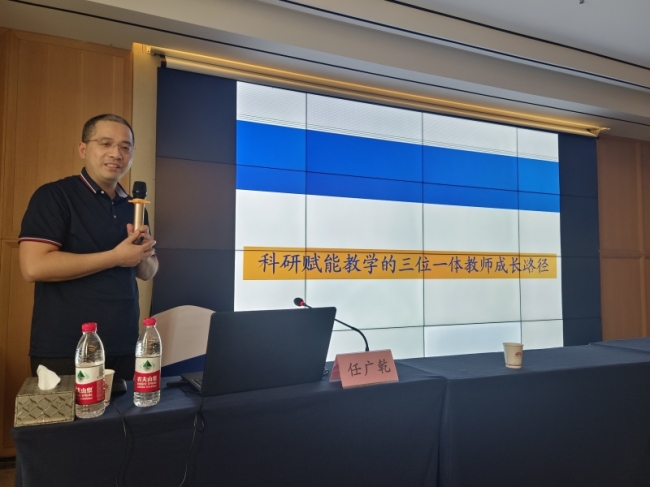 第二场报告由郑州大学博士生导师任广乾教授主讲,他结合实践经历深入解读了“科研赋能教学的三位一体教师成长路径”。任广乾教授围绕任教《公司治理》课程的教学科研经历,从“大学的使命与担当”“大学的学生培养”“大学中的教学研究赋能”“大学中的学科竞赛”“教师个人成长”等方面深入浅出地分享了自己在教学科研、学生培养等方面的具体做法与成功经验,启发全体教师必须“教学为要,科研为基,坚持专注清晰的教学科研方向”,才能更好地助力学生成长。
