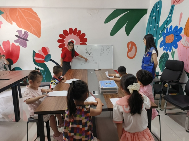 暑期社会实践团邀请到社区的6名小朋友作为新手工室的第一批绘画培训体验者进行绘画,实践团成员耐心示范用简洁的线条勾勒出房屋、树木和人物形状的方法,启发小朋友们用稚嫩的笔触描绘心中斑斓的世界。