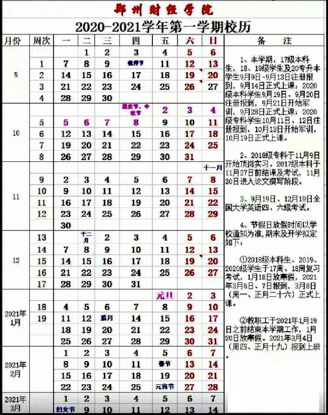 2020-2021学年第一学期校历