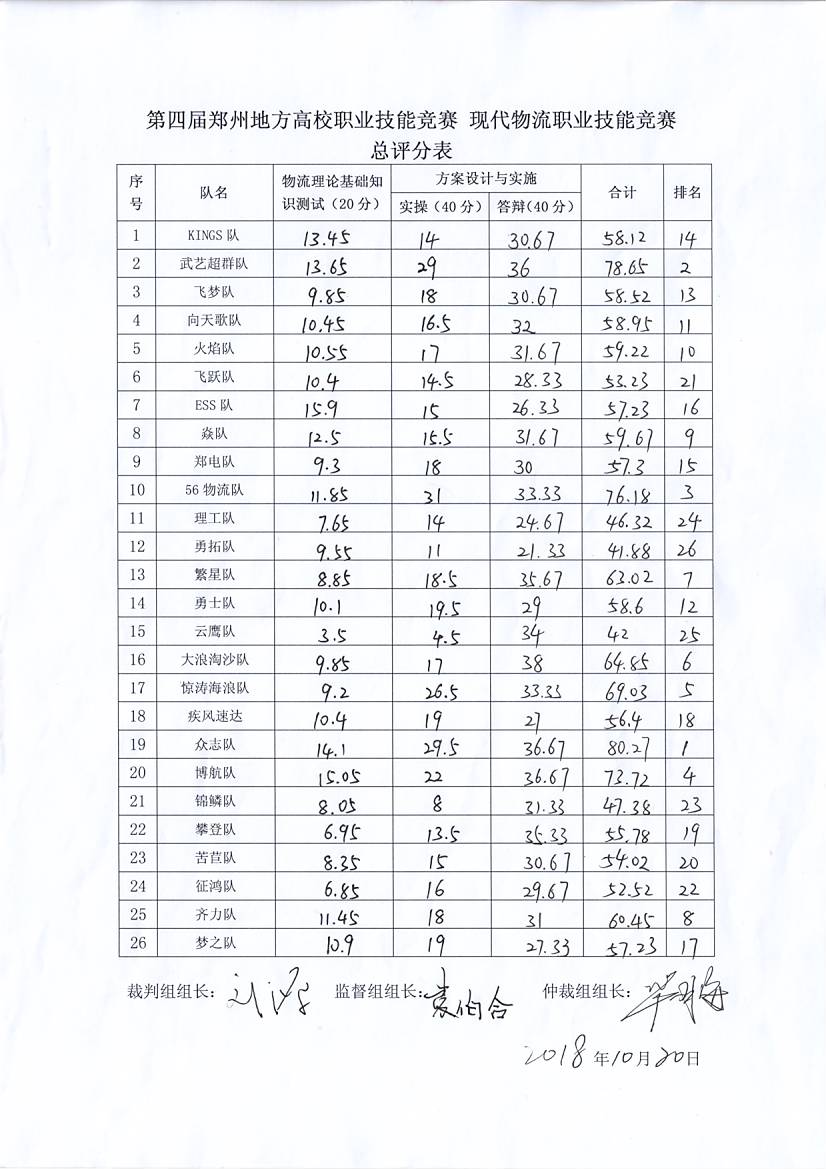 第四届郑州地方高校职业技能竞赛现代物流赛项原始成绩公示