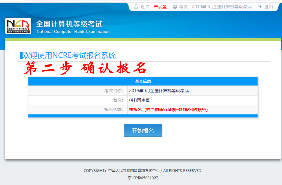 登录成功后跳转到NCRE考试报名系统首页,点击开始报名。
