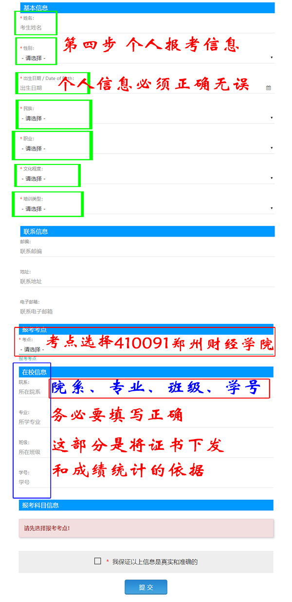 注意:该页面标记为红色*的都为必填项,学院、专业、班级、学号信息是将证书下发的重要依据,必须填写清楚,最后提交。