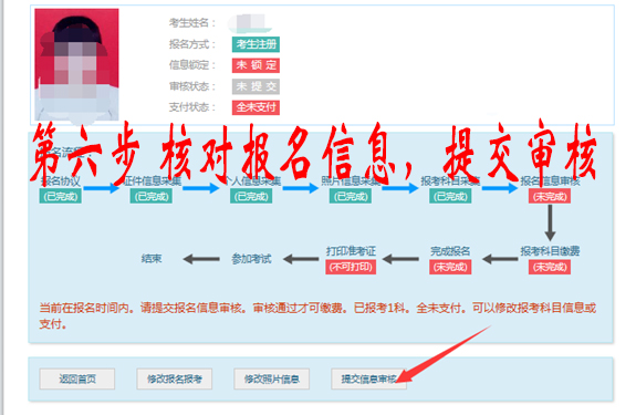 第六步:根据流程,核对自己的报名信息,报考科目等等。