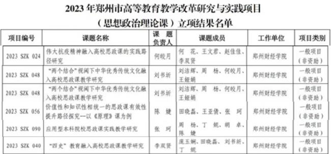 近日,郑州市教育局下发《关于公布2023年郑州市高等教育教学改革研究与实践项目(思想政治理论课和课程思政)立项结果的通知》(郑教高函〔2022〕601号),万象城获批思政课教改立项项目5项,课程思政教改立项项目2项。
