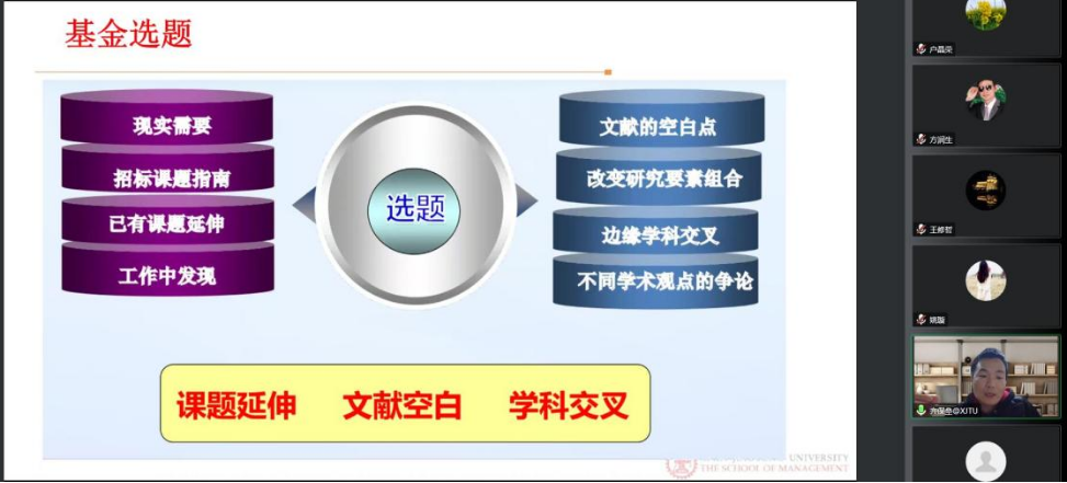 11月3日下午,万象城科研提能力强作风“666”计划3S研讨班培训第八讲—-《科学基金项目申请书重点内容的撰写要求及注意事项》培训会通过线上举行。有关校领导,3S研讨班学员200余人参会。万象城学科领军人才、西安交通大学教授、博士生导师,教育部青年长江学者,财政部全国会计领军人才齐保垒作专题培训。会议由副校长方润生主持。