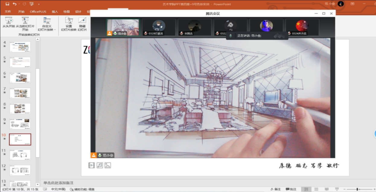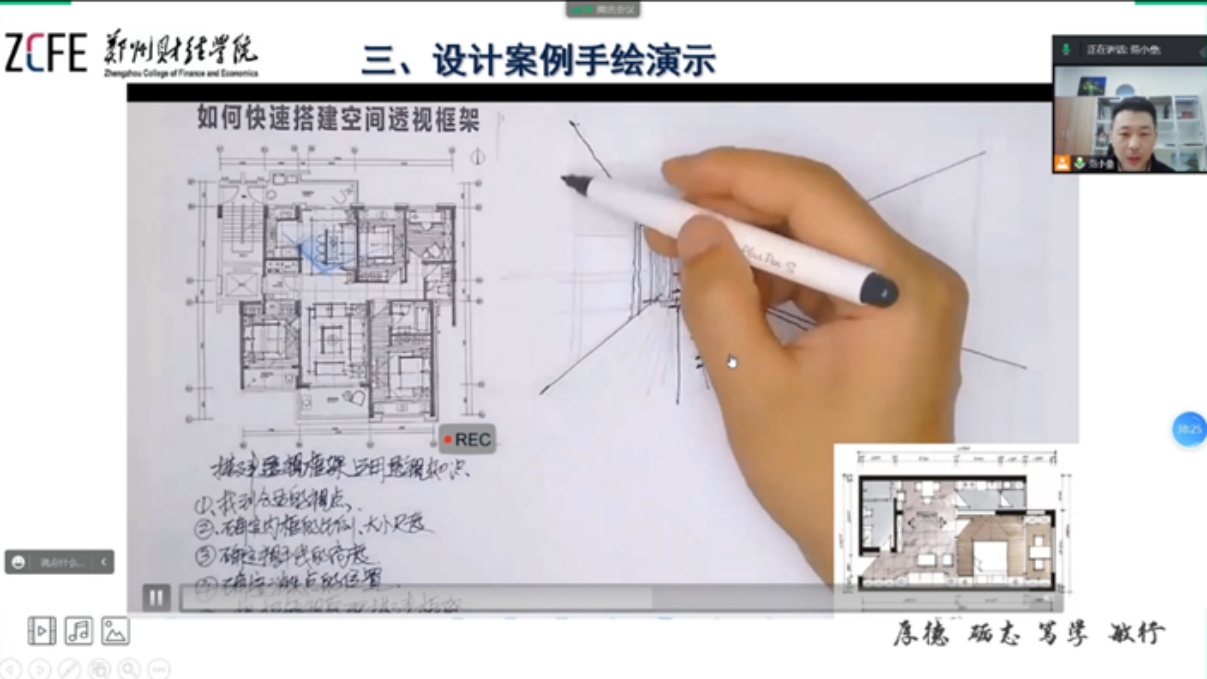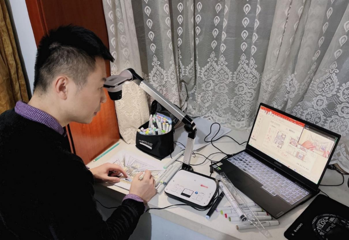 为减少线上教学方式对实践教学环节的影响,艺术设计学院范小磊老师在《效果图表现技法》课程中采用示范性演示与案例教学法,精选学习资源,在手绘技法实践操作的讲解部分利用投影高拍仪设备连接电脑,帮助学生更好地理解课程内容,高效完成课前预习、课中学习、课后作业实践检测等环节。