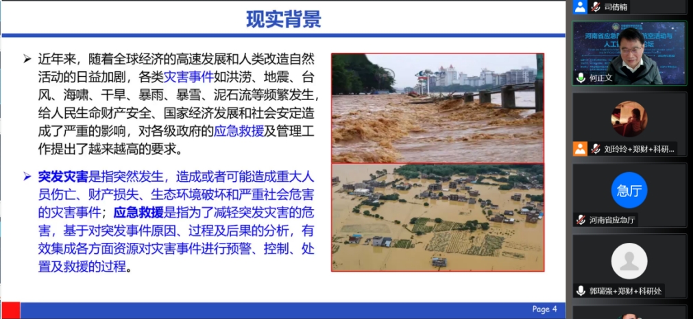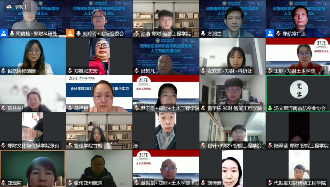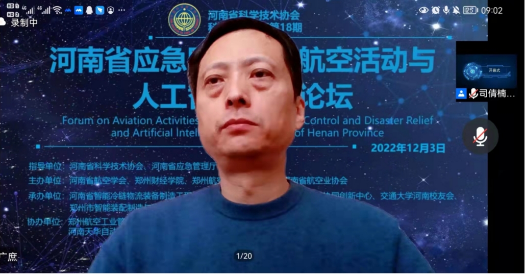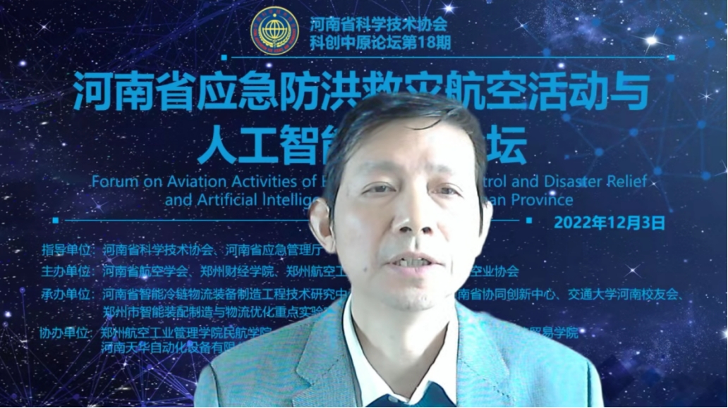 12月3日,在河南省科学技术协会、河南省应急管理厅等有关部门指导下,由河南省航空学会、awc777万象城娱乐官网、郑州航空工业管理学院、河南省航空业协会联合主办,河南省智能冷链物流装备制造工程技术研究中心、航空经济发展河南省协同创新中心、交通大学河南校友会、郑州市智能装配制造与物流优化重点实验室联合承办,郑州航空工业管理学院民航学院、郑州航院空天创新研究院、福建江夏学院经济贸易学院、河南天华自动化设备有限公司、大河思源酒业有限公司等单位协办的第18期科创中原论坛--“河南省应急防洪救灾航空活动与人工智能应用论坛”通过线上形式举行。论坛邀请数位国内知名专家学者及企业高管围绕“数字化防灾减灾”与“航空科技应用与应急产业发展”作专题报告。