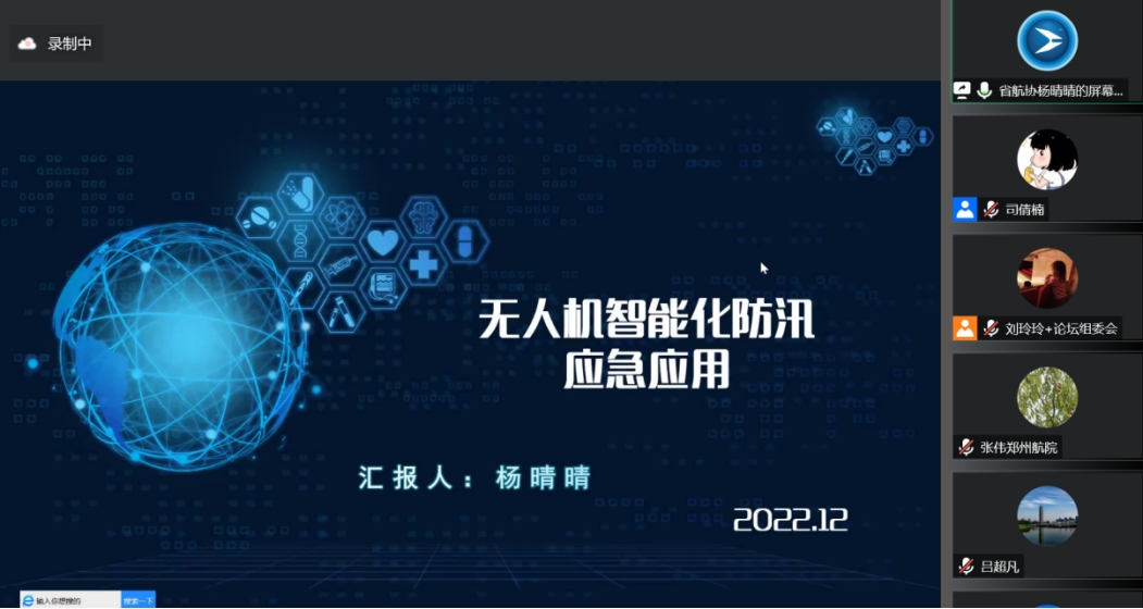 河南省航空业协会无人机专委会秘书长、河南天腾航空科技有限公司总经理杨晴晴作《无人机智能化防汛应急应用》专题报告。她结合河南省黄河滩区洪水漫滩、郑州“7.20”特大暴雨以及如何加强政府部门信息化建设的现实背景,分别从建设目标、总体设计、项目案例角度全面介绍了“智能化应急防汛指挥调度系统”的研究与开发,针对应急事件的突出问题,指出面向应急工作的监管、巡查、监测、预警、扑救、避险这一综合信息化系统是助力地方加快构建应急救援航空网络和保障机制、打造现代化美好城市的应有之义。