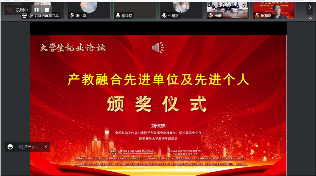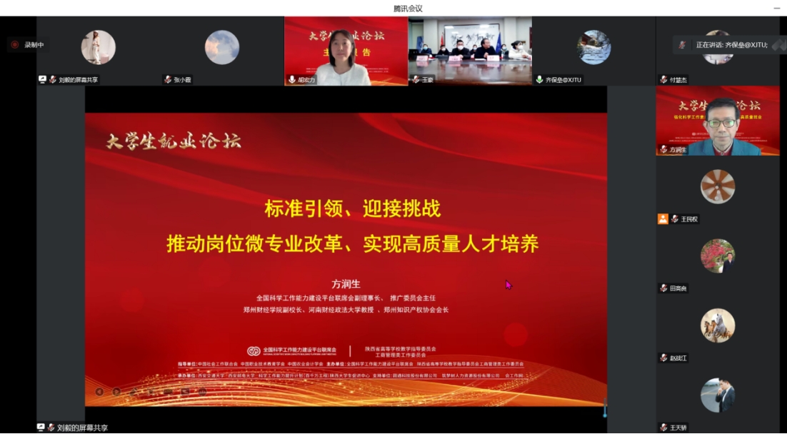 1月12日,由中国社会工作联合会、中国职业技术教育学会、中国农业会计学会联合指导,全国科学工作能力建设平台联席会、陕西省高等学校教学指导委员会工商管理类工作委员会联合主办,西安交通大学、西安邮电大学、科学工作能力提升计划陕西大学生就业促进中心联合承办的“强化科学工作素质培养 保障大学生高质量就业研讨会”大学生就业论坛在西安举办,大会同时通过腾讯会议和小鹅通直播线上进行。
