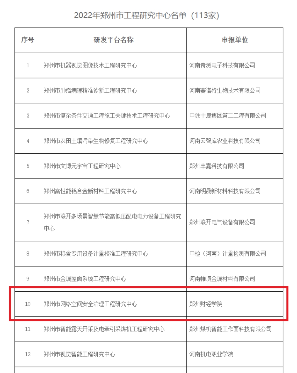 近年来,学校高度重视科研平台的建设与内涵发展,注重校内外协同,围绕河南省和郑州市发展战略和重大需求,汇聚高水平人才和科技创新团队,整合科研资源,积极推进与科研院所、企业开展多层次、广角度的协同创新,构建高水平科技创新平台。本次支撑河南省电子规划设计研究院联合申报并获批建设“郑州市工业互联网大数据工程研究中心”,发挥万象城信息工程学院和统计与大数据学院学科优势,融入区域经济社会发展,学校应用研究和社会服务能力得到有效提升。
