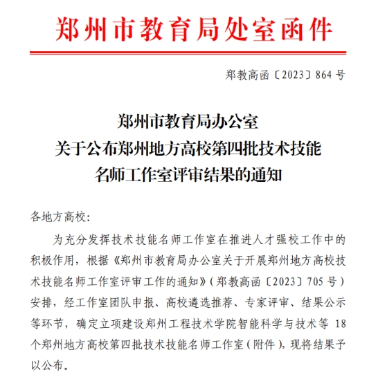 据悉,本次共有19所学校33个工作室团队申报,经工作室团队申报、高校遴选推荐、专家评审、公开答辩、结果公示等环节,确定立项建设18个郑州地方高校第四批技术技能名师工作室。